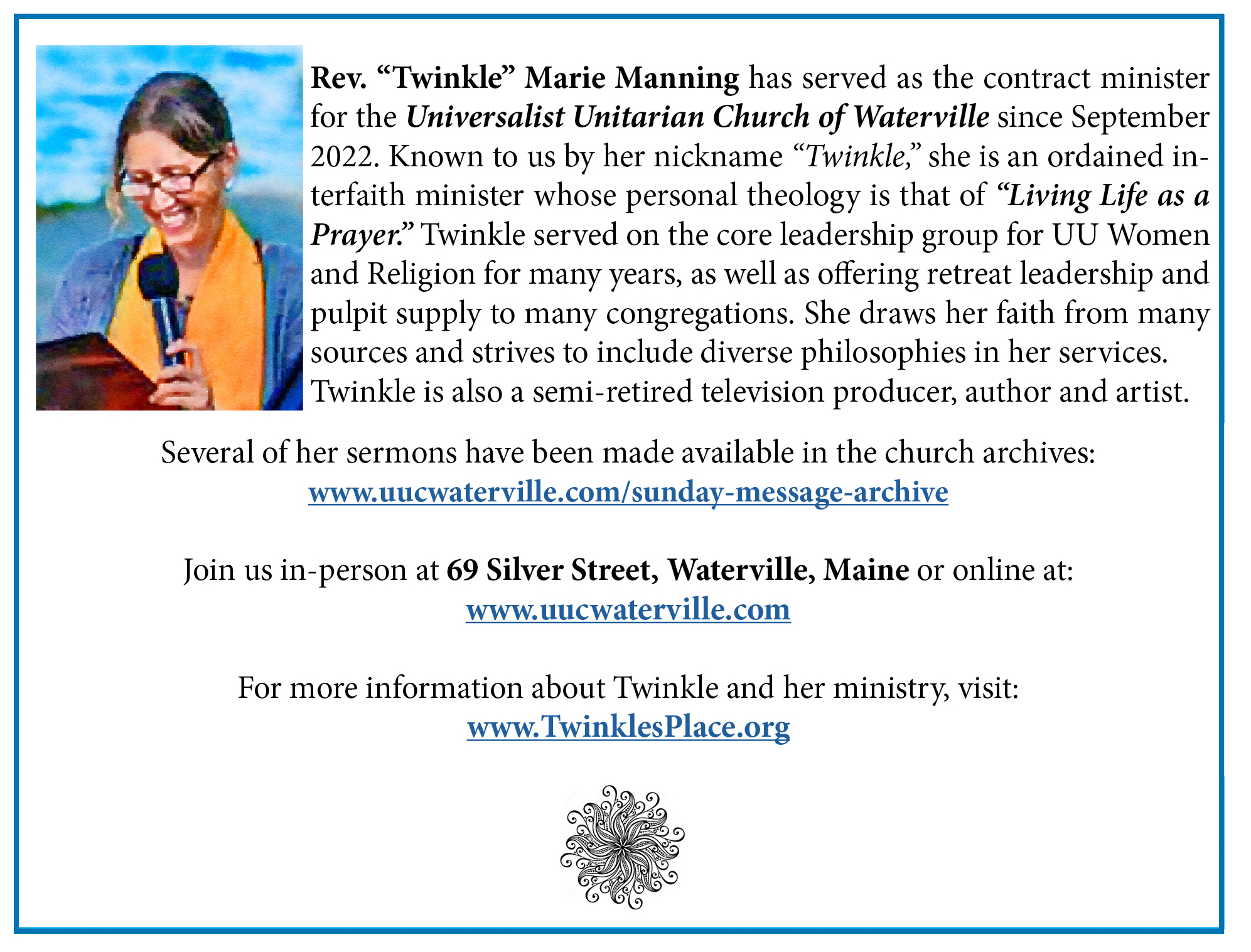 The UU Church of Waterville does not currently provide direct financial assistance, but contributes to the Starfish Village Ministry of the Waterville United Church of Christ. To inquire about assistance with food, housing, etc., please contact the on-call minister at 207-509-1494 or revmostarfishvillage@gmail.com.